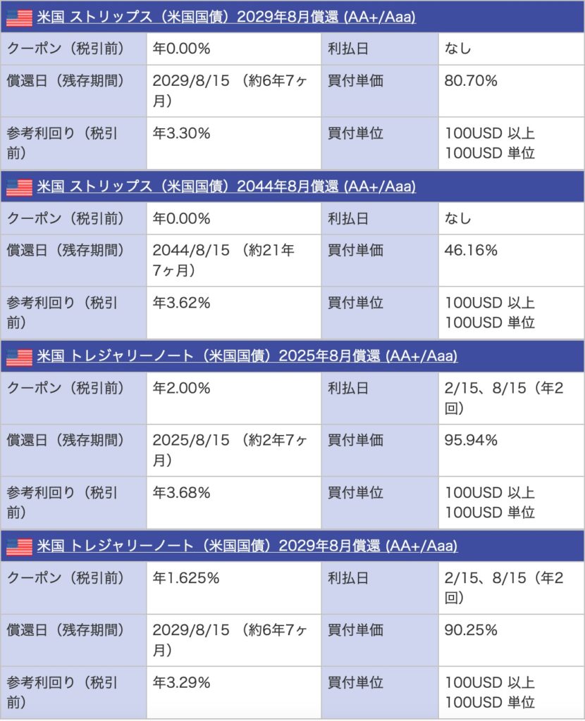 楽天証券では、それぞれ「ストリップス債」「トレジャリーノート」として販売しておりますが、前者が「ゼロクーポン債」、後者が「利付債」と考えていただけば宜しいかと思います。