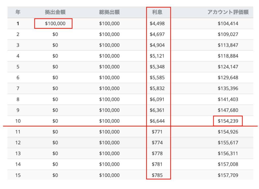 今年USD100,000を投資した場合、10年後の満期時にはUSD154.239になって戻ってきます。