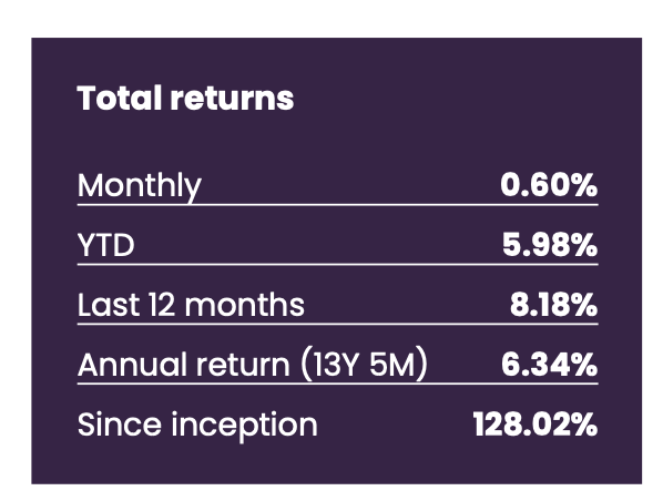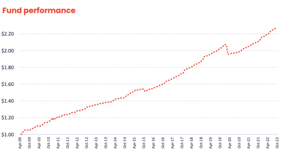 ファンド開始してからのリターンが約128%、つまり倍以上になっています。ほぼ落ち込むことなく、上がり続け、安定した運用を継続していることが分かります。