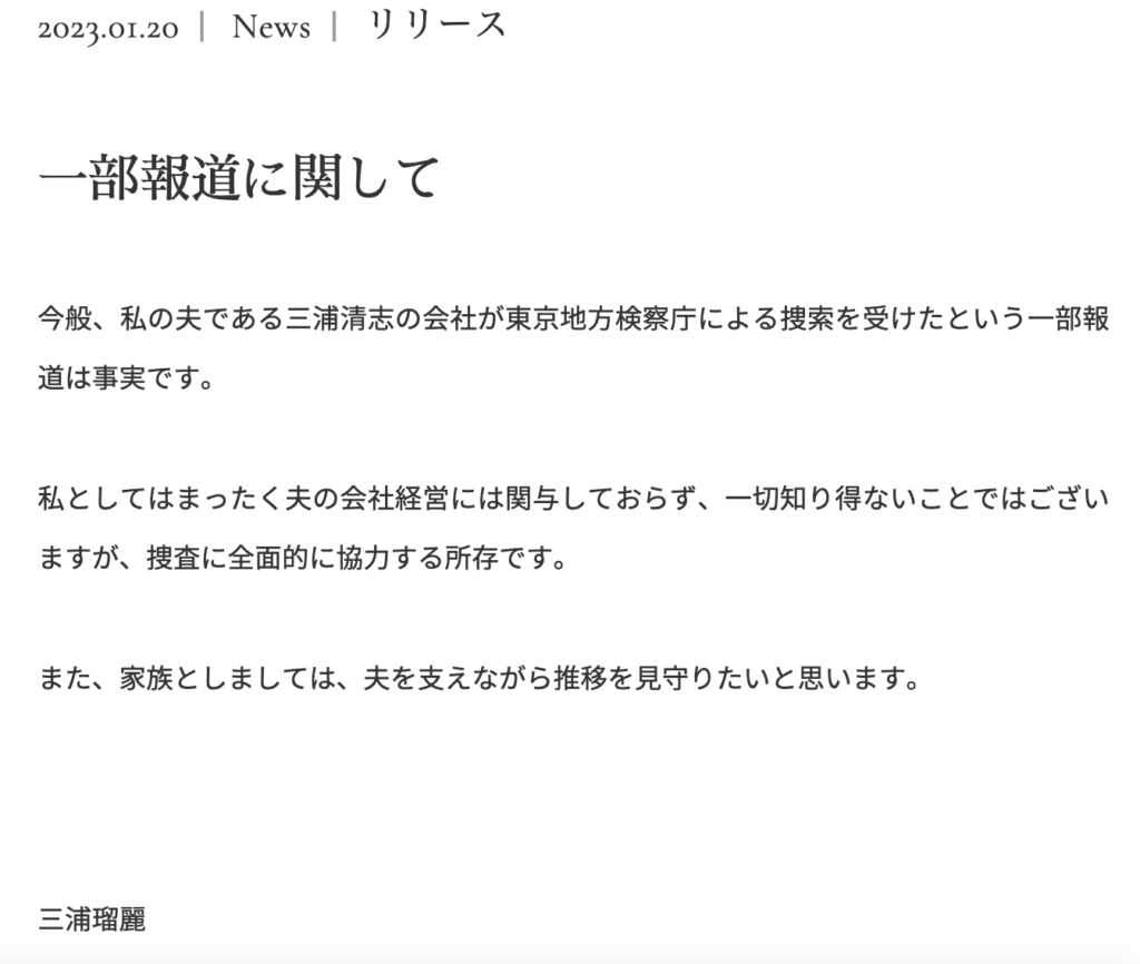 「私としてはまったく夫の会社経営には関与しておらず、一切知り得ないことではございますが、捜査に全面的に協力する所存です」