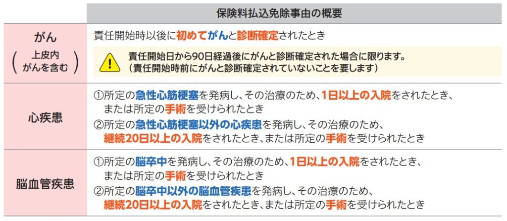 3大疾病(がん、心疾患、脳血管疾患)で所定の事由に該当されたとき、以後の保険料払込を免除。