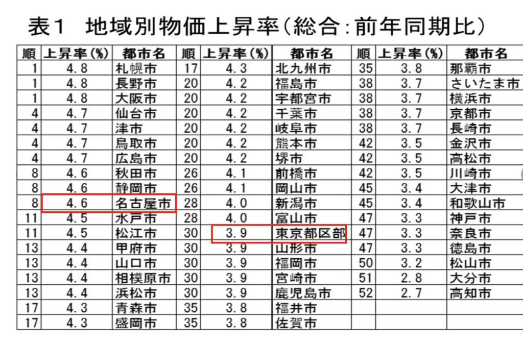 わたくしが住んでいる名古屋市の物価上昇率も前年同期比で4.6%まで上昇してきております。