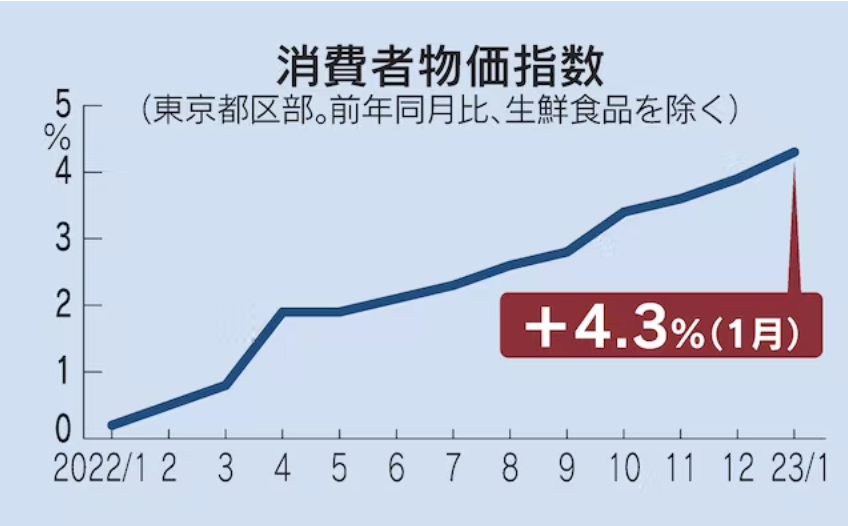 ちなみに、これは2022年12月時点のものですから、現在はもっと上昇しているかも知れません。実際、2023年1月の東京都区部の消費者物価指数は、前年同月比4.3%と上昇しておりました。
