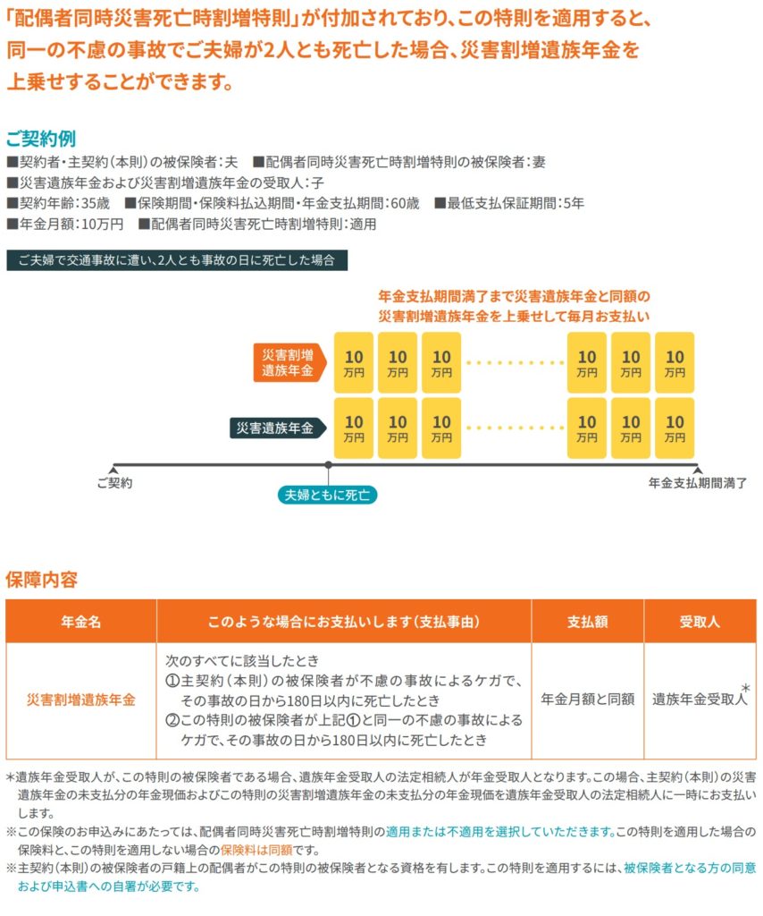 この特則を適用すると、同一の不慮の事故で本人および配偶者が2人とも死亡した場合、災害割増遺族年金を上乗せすることができます。