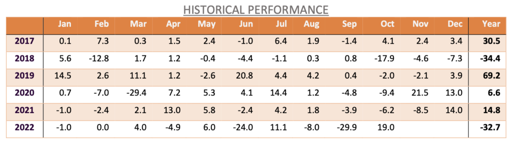 過去の結果として二桁台のプラスが過去に9回。二桁台のマイナスが5回出しています。2022年は特にマイナスが大きくなっています(10月現在)