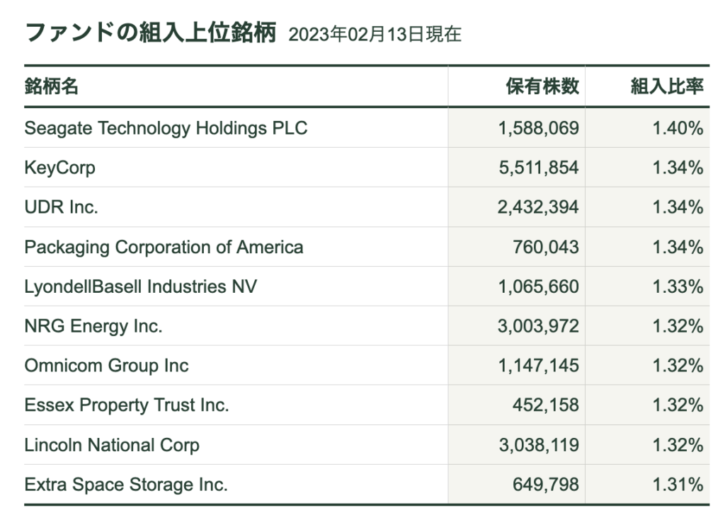 こちらは2023年2月13日時点の組入上位10銘柄ですが、「VYM」や「HDV」がよく名前を見る企業で構成されてきたのに比べ、こちらはあまり見ない企業も多いのではないでしょうか。