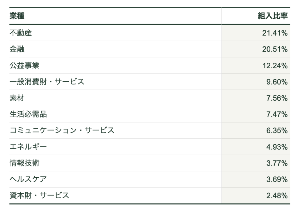 こちらは、2023年02月13日現在のセクター別構成比率ですが、不動産、金融、公共事業の割合が大きいですね。