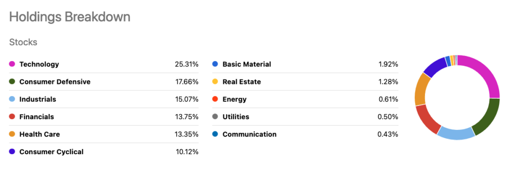 セクター割合を比較してみると、「DGRW」(上)と「VIG」(下)は上位5つは同じですし、ただその割合が異なるだけです。