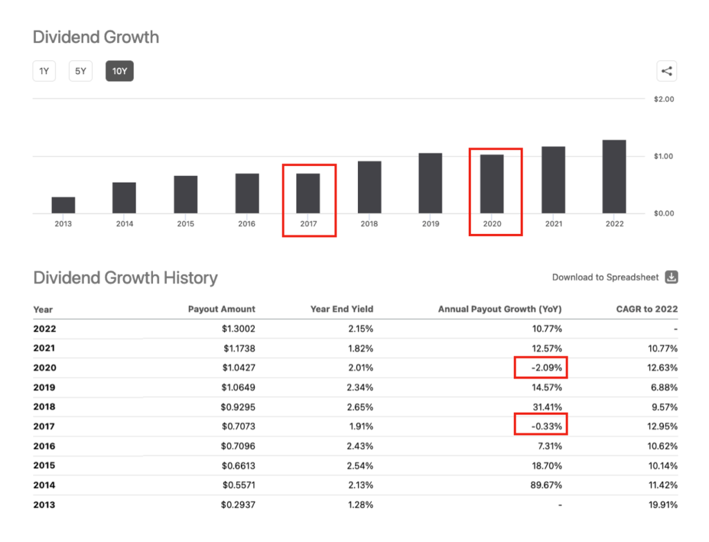 連続配当は2年となっておりますが、これは2020年に−2.09%と少し増配率が下がってしまったからで、2017年にも-0.33%と少し増配率が下がりましたが、基本的には右肩上がりに配当金は増えております。