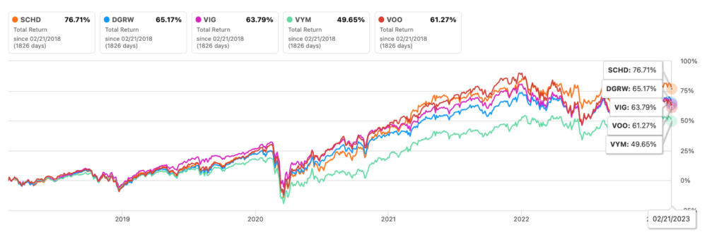 例えば、VOO(バンガードS&P500ETF)は、S&P500指数と同等の投資成果を目指すETFですが、5年間のトータルリターンをここで紹介しているETFと比べていただくと、「VOO」よりも「SCHD」「DGRW」「VIG」の方がトータルリターンは高くなっております。
