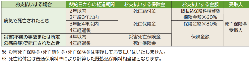 被保険者が死亡した時に死亡保険金額を受け取れます。ただし契約から2年以内に病気で亡くなられた場合は、保険料相当額しか支払われません。3年目は保険金額の60%、4年目は保険金額の80%、5年目からは保険金額の100%が支払われます。災害死亡の場合は、4年以内でも保険金額が満額支払われます。