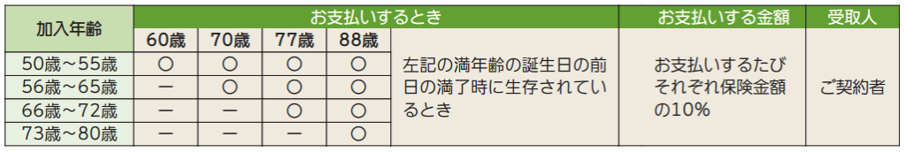 60歳、70歳、77歳、88歳の誕生日の前日の満了時に生存されている時に受け取れます。