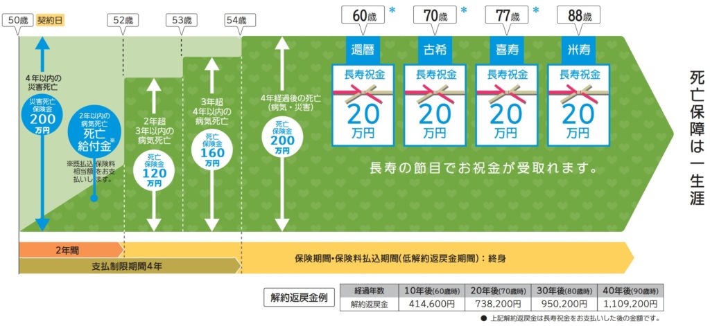 この保険は契約日から2年以内は保険料が返還されるだけで、3年目は保険金額の60%、4年目は保険金額の80%なので、保険として機能するのは5年目からになります。そして上述の通り長く保険料を支払うと保険金額以上の保険料を支払うことになるので、それまでの期間が保険として機能するだけです。50歳の契約例の場合は、3年目〜20年目までに死亡した場合は保険料より多い死亡保険金が支払われるので保険の意味が有ったということになります。