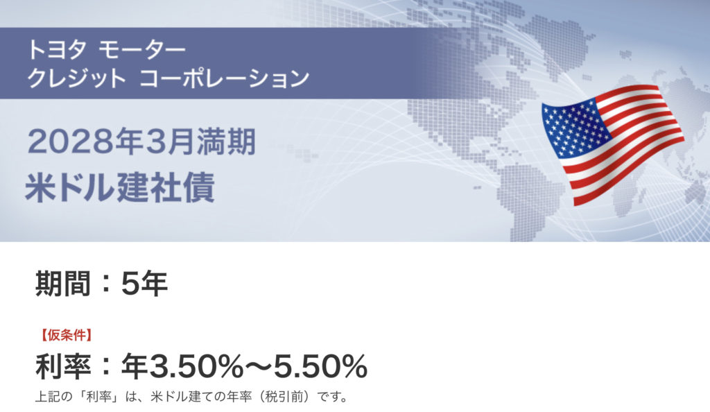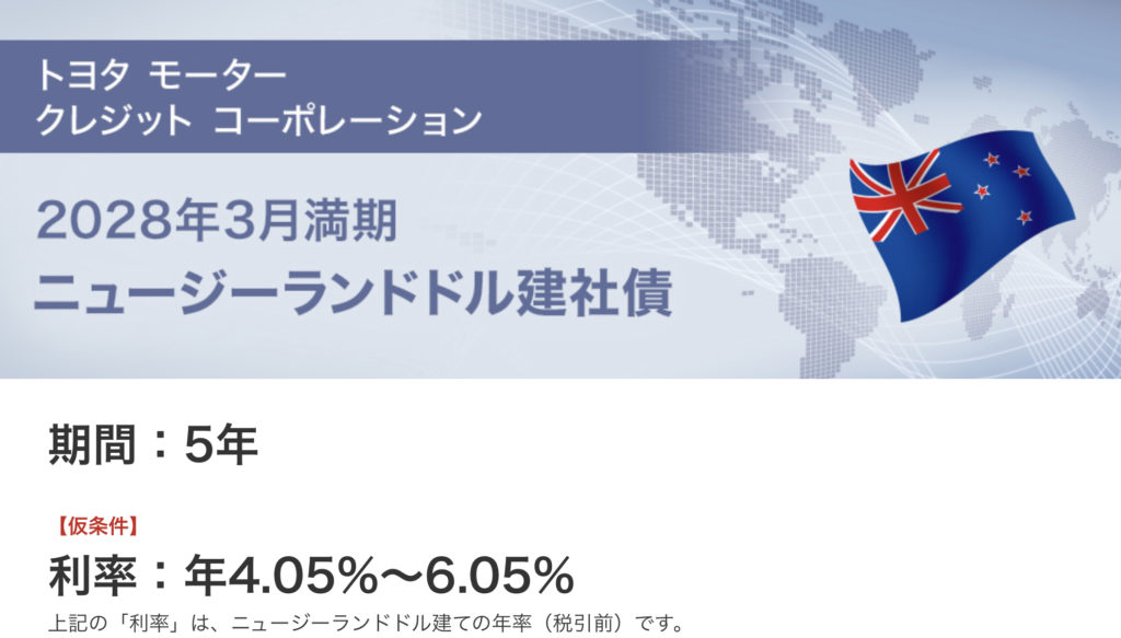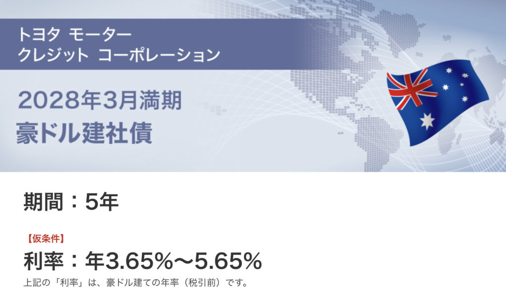 本日は野村證券でも募集している新発債券「トヨタ モーター クレジット コーポレーション 2028年3月満期社債(米ドル、豪ドル、NZドル建て)」の解説をします。日本以外、各国利上げをして、債券投資も面白くなってきましたね。