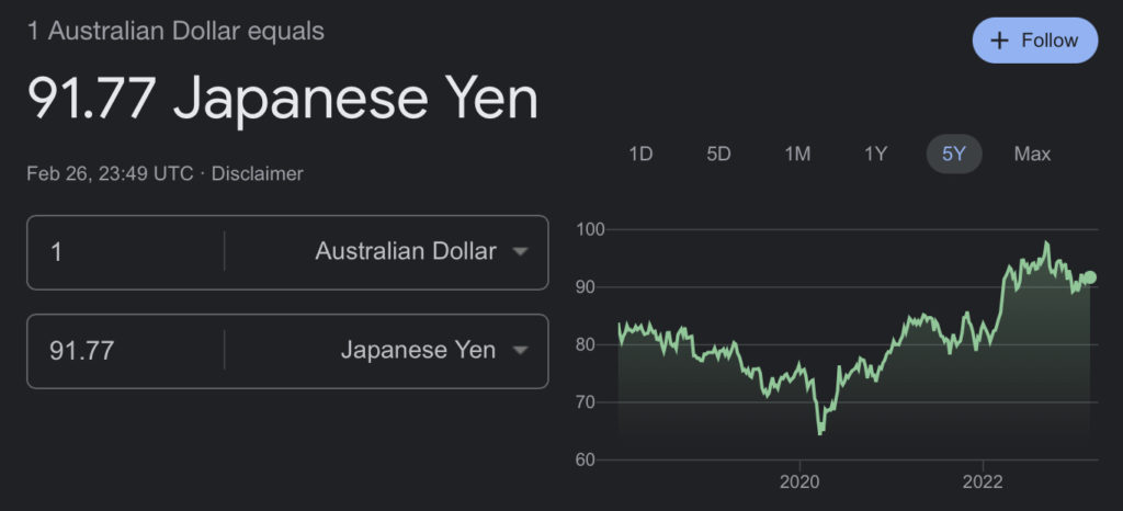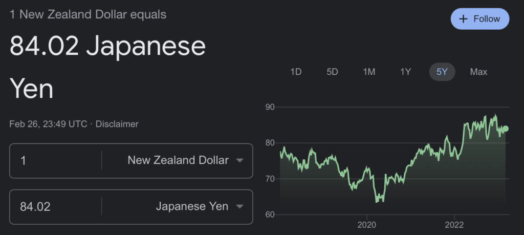 豪ドルとNZドルは同じような動きをしていますね。これは過去5年でのチャートですが、長期で見てもこれまで豪ドルで120円、NZドルで100円を超えるというのはありませんでしたから、円安になってもそれ以上になることはなかなか想像できません。