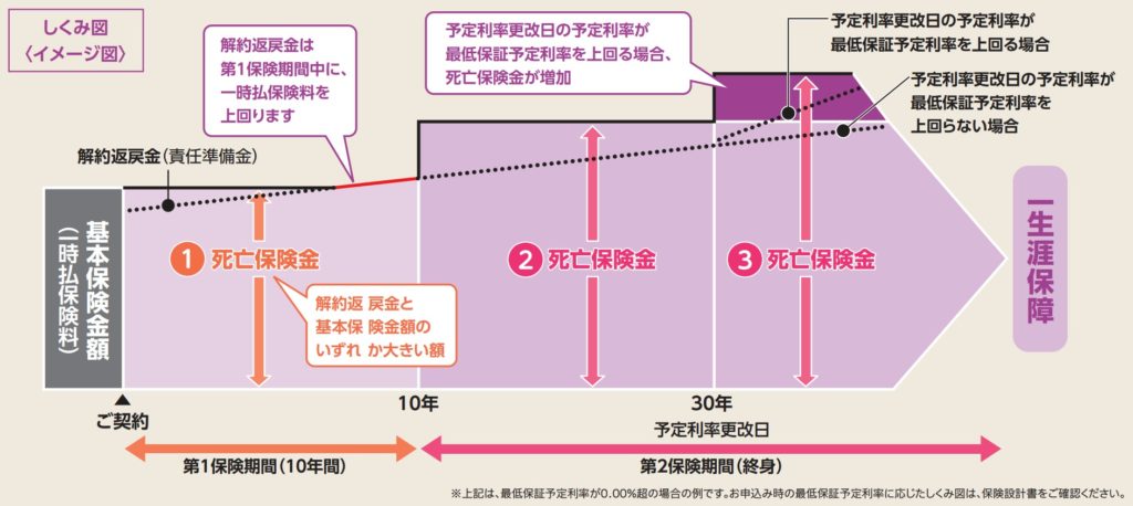 一時払の円建終身保険です。一時払で支払った保険料が基本保険金額となり、第1保険期間中(契約から10年間)に解約返戻金が一時払保険料を上回ります。第2保険期間(11年目以降)からは契約時の予定利率に応じた死亡保険金額になります。30年毎に予定利率が更改され最低保証予定利率を上回ると死亡保険金額が増加する仕組みです。