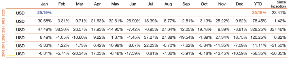 こちらが運用成績。これまでのファンドとは、上昇も下落も数値の大きさが違いますね。いきなり2018年は半分(−50%超え)になり、2020年は120%、さらに2021年は300%を超えたかと思ったら、2022年は−78%と、1年のリターンの数値とは思えない大きさです。仮想通貨は、まだまだボラティリティが高く、毎年相当動いていることがわかります。まだ仮想通貨という始まったばかりのエリアでのファンドですから、手探りなところがあるのでしょう。投資先や国、さらには戦略を分散させていますので、ここからより安定した運用を探っていくと思われます。
