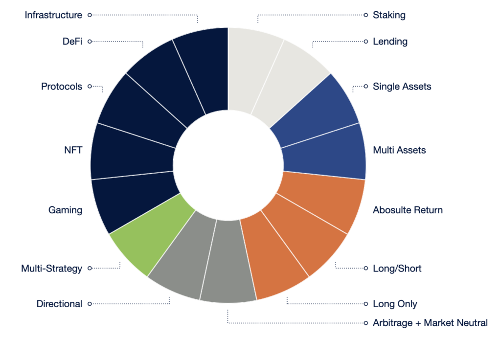 このファンドはブロックチェーンと仮想通貨に焦点を当てたファンド・オブ・ファンズです。投資規模、仮想通貨資産、運用国、運用戦略など投資先を分散することで、リスクを減らし、相対的リターンを目指します。またヘッジファンドのようにロングショート、アービトラージ、マルチストラテジーといった戦略が取られ、リスクを減らし絶対収益を目指しています。DeFiやNFTといった仮想通貨関連、さらにはGamingやロングオンリーなど見受けられるように、様々な戦略に分散してリターンを狙っていることが分かります。他のファンドと比べても、かなりの分散です。
