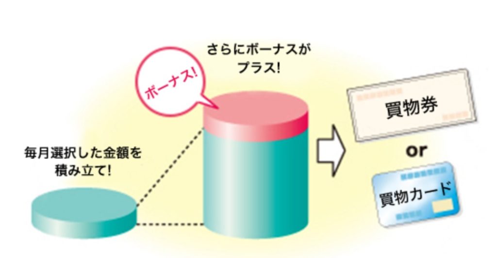 例えば、10,000円の積立12ヶ月すると、1ヶ月分(10,000円)のボーナスが追加され、1年後の満期時には130,000円分の買い物ができるというものです。