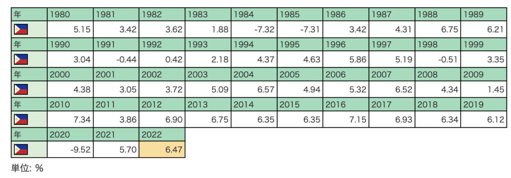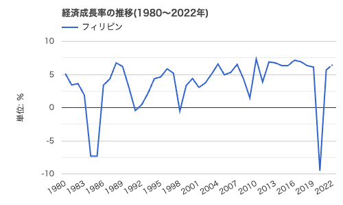 人口ピラミッドを見てもらえれば分かる通り、今後人口が増え続けると予想されます。フィリピンの人口ボーナスのピークが2030年と言われていますが、このグラフを見る限り、まだまだ人口が増え続けることになりそうです。少なくともここ10年は経済的にも、産業的にも大きく発展していくでしょう。日本の高度成長期に似ていますね。さらにGDPの伸びがまだまだ期待できるということ。