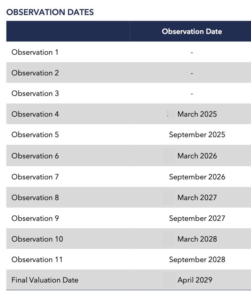 年6.5%の固定金利、こちらは確定しています。ただし最初に話したとおり早期償還があり得るということ。最初の2年間は償還されることがありませんが、2年後から半年ごとにある算定日に、算定基準である3つのインデックス(S&P500、Nikkei225、Eurostoxx50)全てが運用開始時の株価(100%)以上になっているとその場で早期償還となります。こちらがその日程となります(日付は伏せてあります)
