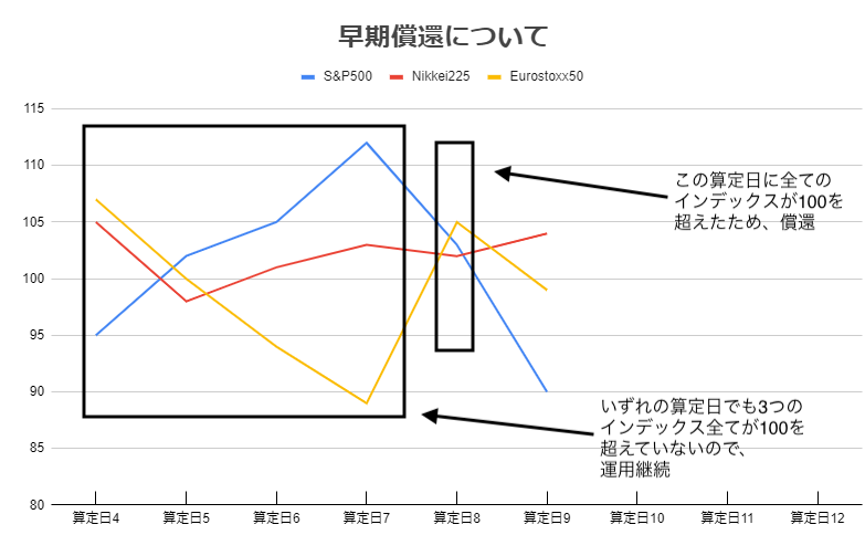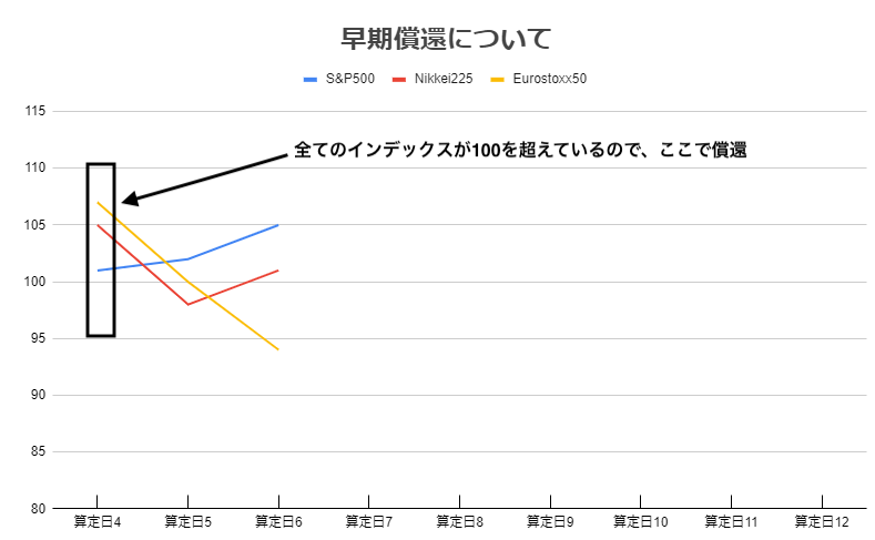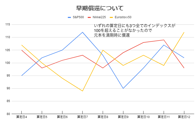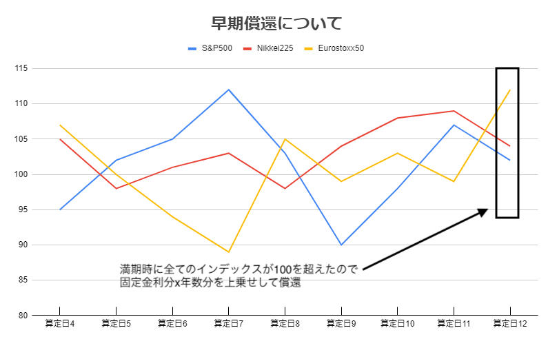 つまり3つのインデックス全てが算定日に100を超えた場合、固定金利x運用年数分がプラスされて償還されるということです。そうならない場合もありますが、それは以下の場合です。