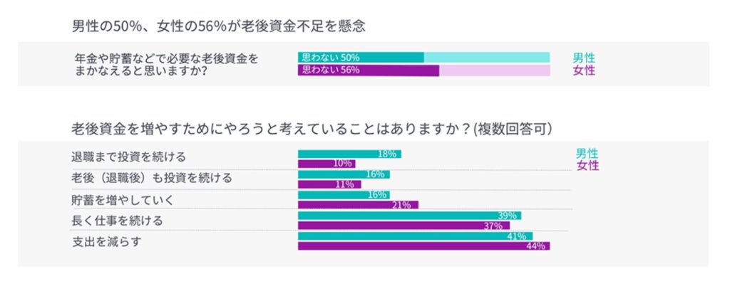 女性の56%が年金や貯蓄などで老後資金をまかなえると考えておらず、老後資金を増やすために、「長く仕事を続ける」ことや「支出を減らす」ことで対応していくと考えている方が多いようです。