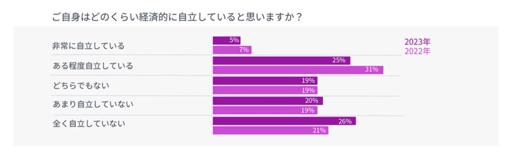 「経済的に自立していると思うか」という質問に対して、46%の女性が「全く自立していない」「あまり自立していない」と回答するなど、1年前の調査よりも女性の経済的自立意識は鈍化しています。