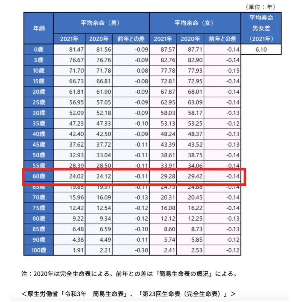 厚生労働省の「簡易生命表(令和3年)」によると、2021年の日本人の平均余命は、60歳男性で約24年、60歳女性で約29年です。