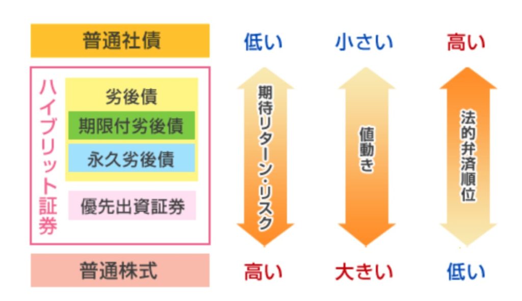 発行体がデフォルト(倒産)した場合、残っている資産の分配において、普通社債から順番に弁済されていくので、優先債務の全てが弁済されるまで、当該債券に対する分配は行われず、法的弁済順位が低くなればなるほど、利金が受け取れないリスクが高くなります。