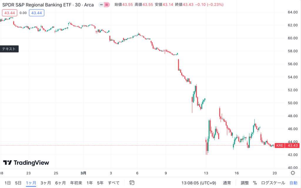 SPDR® S&P® Regional Banking ETF(KRE)の株価は3月に入ってから大きく下げております。