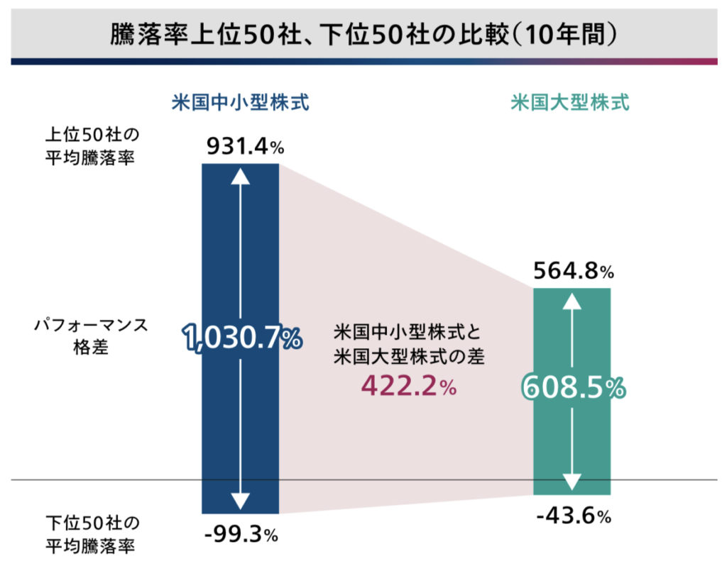 それぞれの上位5社、下位50社の騰落率を見ても、米中小型株の方がハイリスク=ハイリターンだとわかりますよね。ただ10年間投資した結果を見ると米中小型株の方が422.2%高いリターンが出ています。