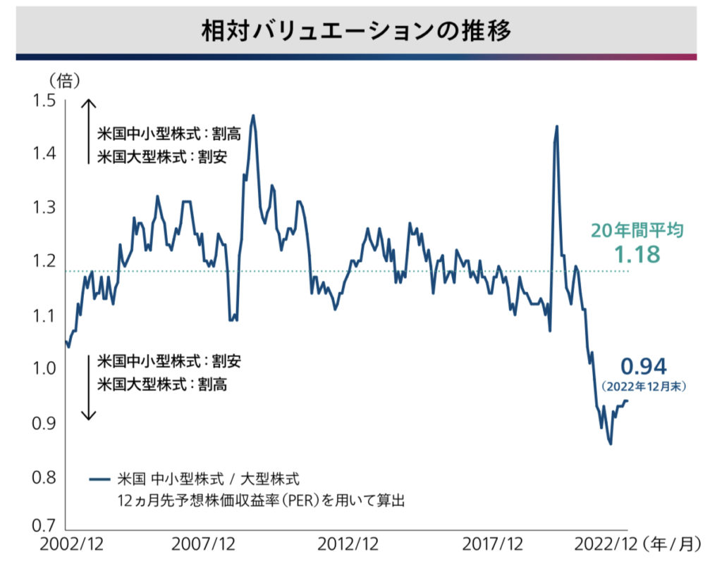 2022年の利上げによる株価調整で、今(2023.3)はとても割安な状態です。米国大型株よりも米国中小型株の方が割安なようですね(それだけ既に下げた)。