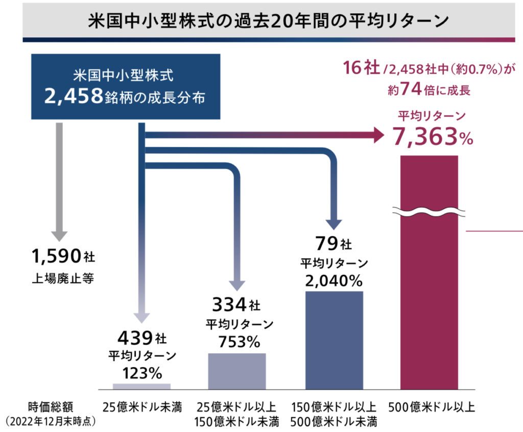 これまで20年間にあった米中小型株、2458銘柄のうちなんと1590社が上場廃止をしています。これは破綻したという例もあるでしょうけれど、どこかの企業に買収をされた(良い意味)というケースも考えられます。