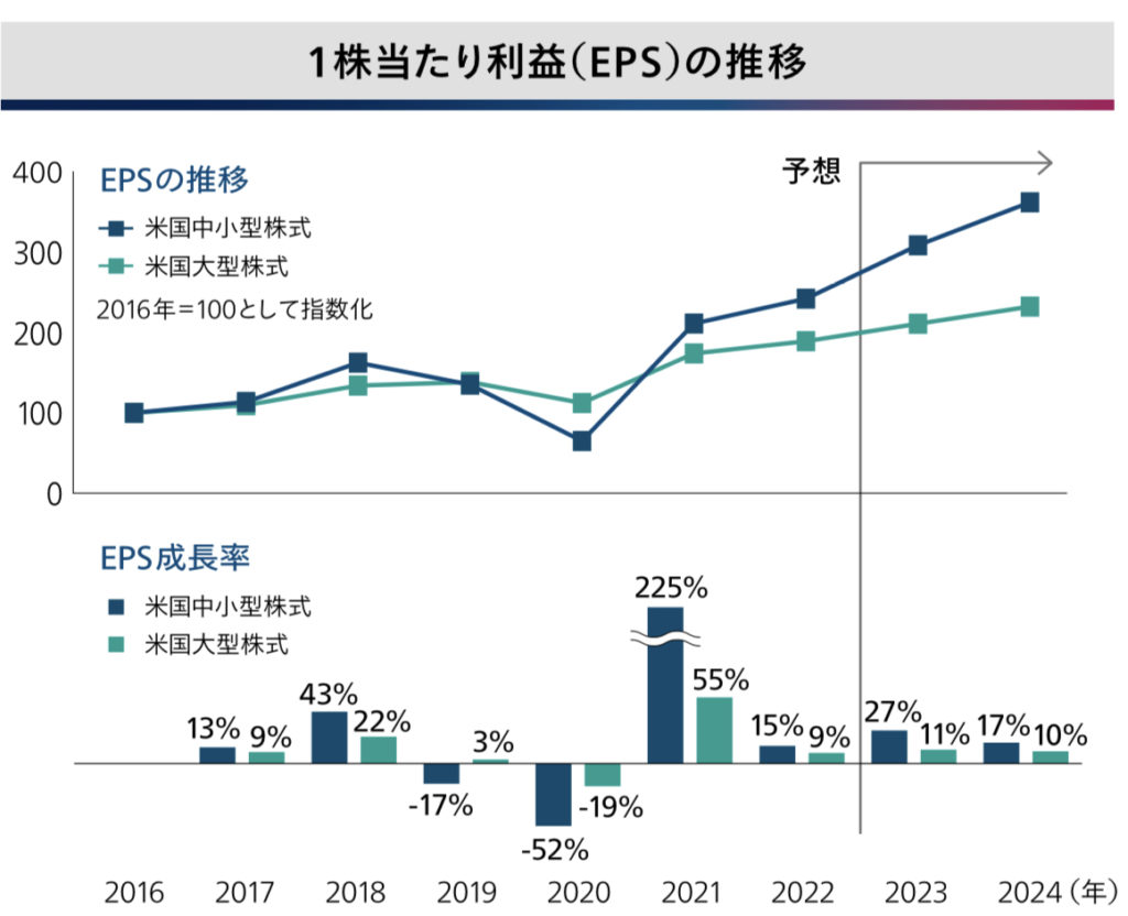 EPS(1株当たり利益)というのは利益が増えれば上がります。利益は米国株全部増えていく見込みですが、大型株よりも中小型株の方が伸びるようです。