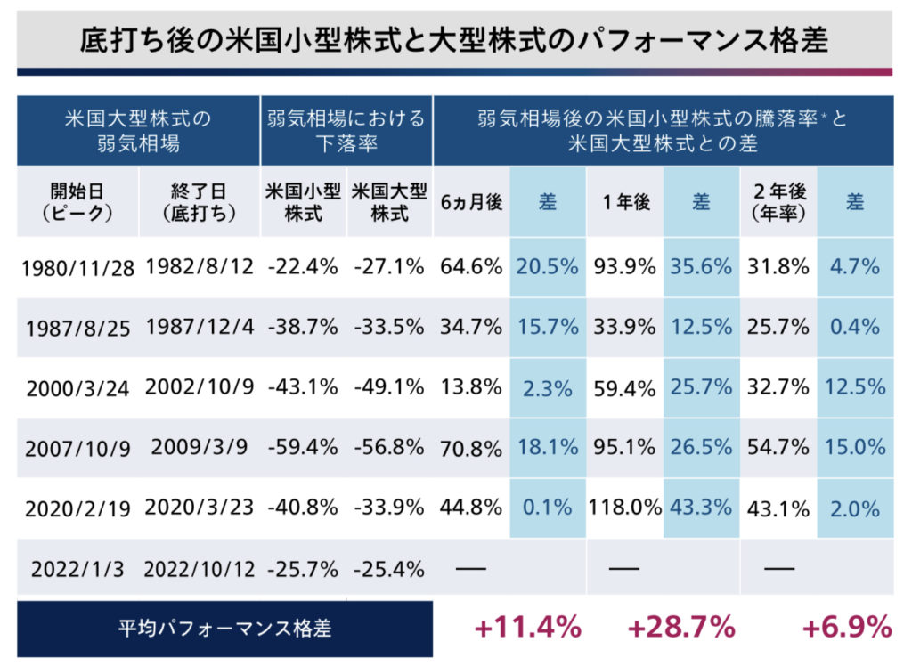 そして株価が安くなった後、株価が戻る過程では、圧倒的に中小型株の方が大型株よりも高いリターンをあげていることが、過去のデータからわかっています。今回(2022年)、歴史に残る下げ相場だったので、その後の上げが楽しみですね。