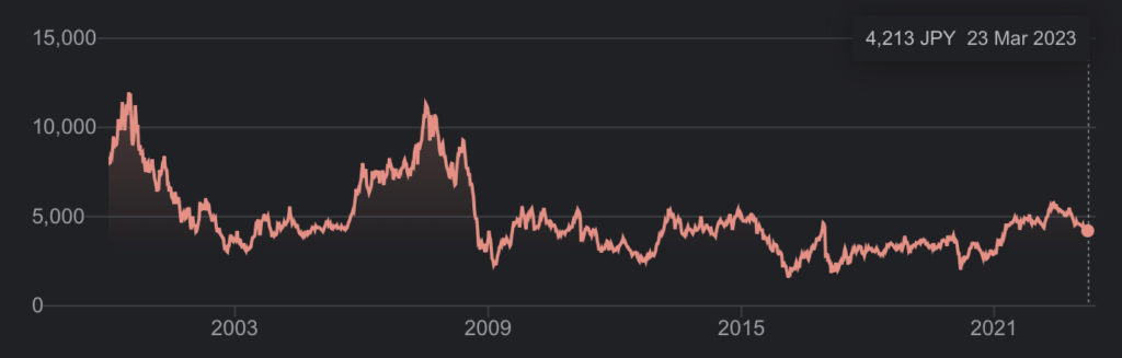 こちら東芝の株価。2023.3.23現在、4213円でTOB価格が4620円。一応10%のプレミアムがついています。投資家皆さんがいくらで買ったかにもよると思いますが、2008年の金融危機以降、5000円を超えたつい昨年の値段と比べてもそんな悪い値段ではないように思えます。というかこのまま上場していても、全く再建の目処が立たないので、投資家は喜んでTOBに応じるのではないでしょうか。
