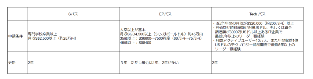 SパスとEPパスが就労では一般的です。Sパスは主に一般職の方を対象としています。EPパス(Employment Pass)はもう少し条件が厳格です。申請には学歴と収入が重視されるため、雇用する企業もその基準に沿ってサラリーを提供する必要があります。上記を見ていただければわかるように、給与額が非常に大きく設定されています。企業側の負担が大きくなることが分かりますね。