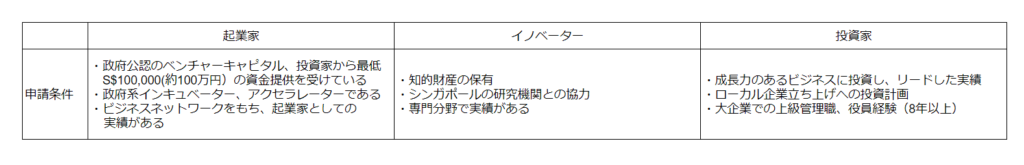 シンガポール政府が、IT人材誘致のために2021年1月から導入した新しい制度であり、かなり高い要件が求められています。上記条件のうち2つを満たせば、個人で申請することができます。
