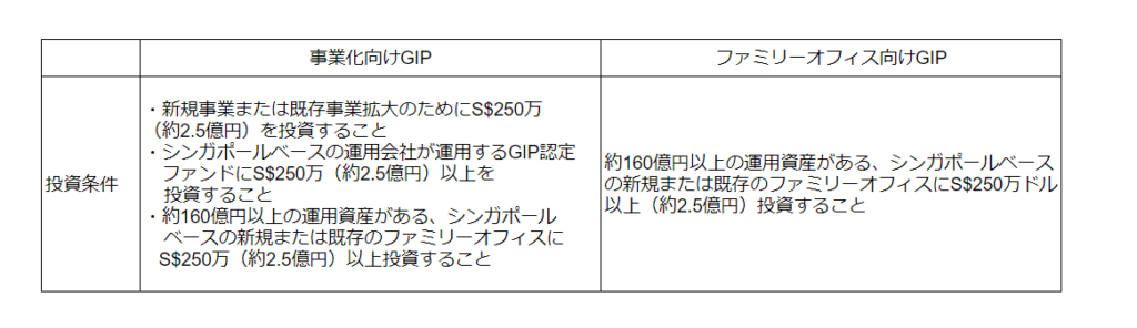 GIPには大きく分けて、事業家向けとファミリーオフィス(資産家ファミリー)向けの2種類の投資永住権があります。投資金額はS$250万ドルで新規ビジネスか認定のベンチャーファンドに投資するか、運用資産がS$2億ドル(約200億円)以上のシンガポール拠点のファミリーオフィスにS$250万ドル(約2.5億円)投資するか等を求められます。