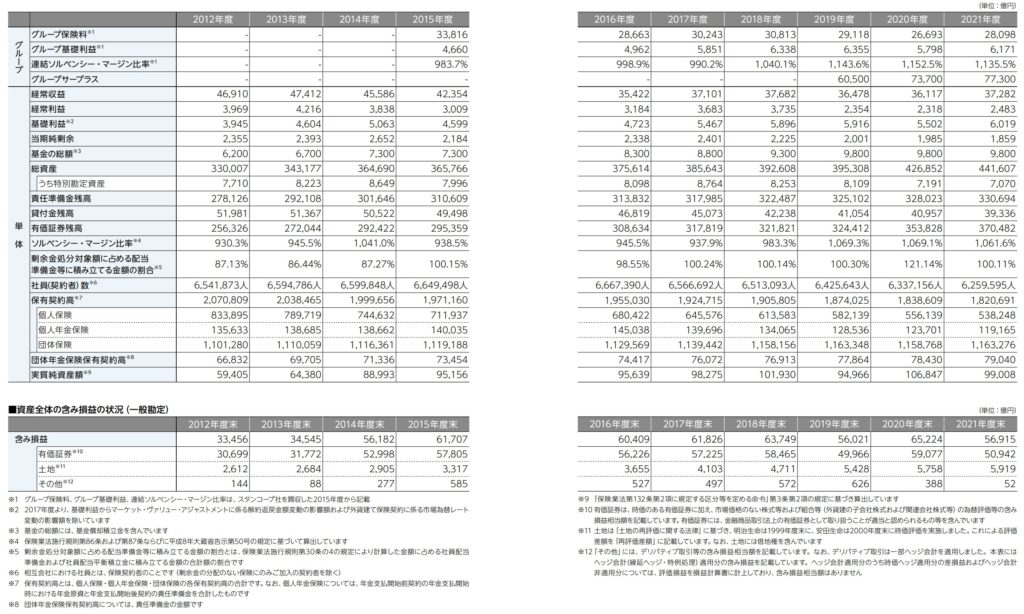 単体とグループに分かれていますが、グループには「スタンコープ社」をはじめとした明治安田生命グループの子会社等の業績を加えた数字になります。2020年度はコロナの影響で大きく売上が下がっていますが、2021年には少し戻しています。ただ単体としてみると保有契約高の「個人保険」と「個人年金保険」が年々減少しています。満期を迎えた契約が抜けていきますが、それ以上に新規の契約が獲得出来ていないことが要因でしょう。今はお客さん自身で情報をいくらでも収集できる時代ですから、ネットで調べればどの商品が良いかある程度は判断できます。また代理店などを通して各社を比較してから加入するのが主流になっているので、昔からの生命保険募集人による営業だけでは成約に至らないケースが多々あるのではないでしょうか。そして比較をされると漢字系生保(日本生命、第一生命、明治安田生命、住友生命など)は、スペックで劣るので自然と離れていっているのでしょう。