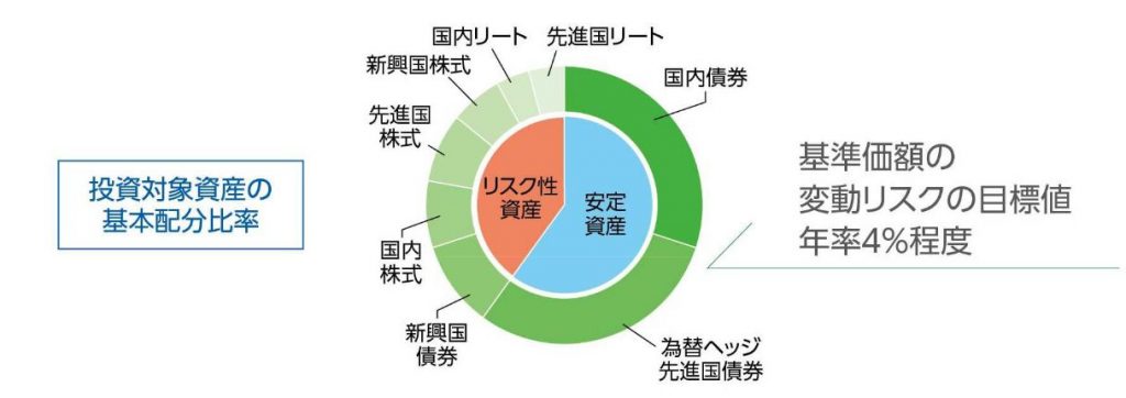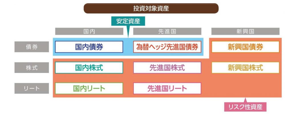 「投資のソムリエ」は世界の債券、株式、リートに投資するバランス型ファンドで、2つの「安定資産」と6つの「リスク性資産」を投資対象資産とし、市場環境に応じて現金等も含めてその配分比率を調整してくれます。