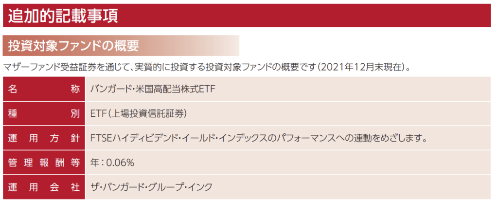 インデックスなので指数連動です。FTSEハイディビデンド・イールド・インデックスが対象インデックスになります。投資対象ファンドはバンガード・米国高配当株式ETF。VYMという名称で米国高配当株式では代表的なETFになります。