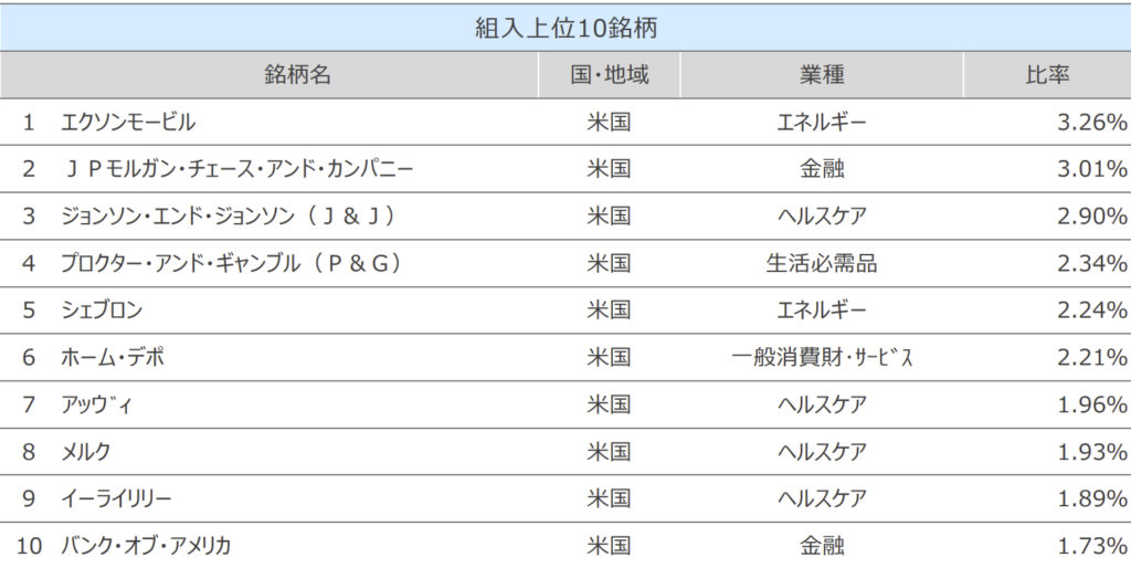 投資先ETFの組入銘柄上位はこのようになっています。高配当株式だけあって歴史がある会社が多いですね。