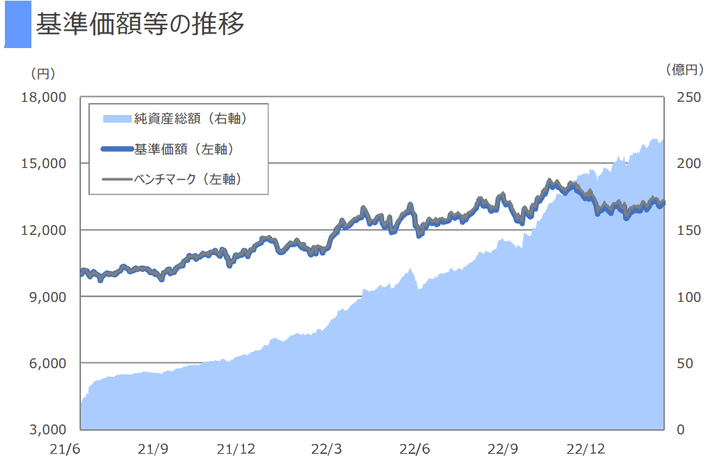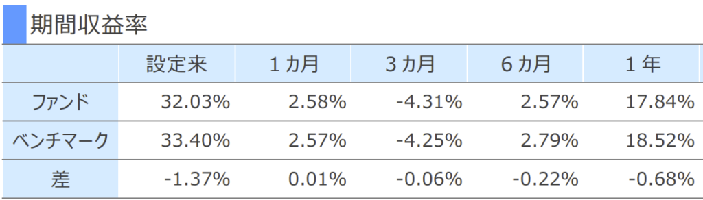 直近1年で+17.84%、設定来で+32.03%の騰落率になります。ベンチマークは先ほども触れたFTSEハイディビデンド・イールド・インデックスになります。(ファンド設定日:2021年6月29日)