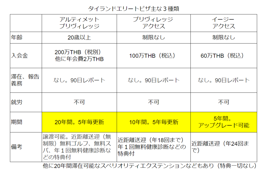 このビザの売りは様々な特典。他の国ではちょっと考えられません。例えば出入国時に空港でファーストトラックを利用、リムジンサービスでの無料送迎や90日レポートや銀行口座開設のサポートもあります。種類によっては無料ゴルフ場、無料スパ、買い物の特別割引券もあります。条件的にも一番高いビザで200万THB(約800万円)。それ以外の取得条件も犯罪歴がないなどの一般的な条件ですので、非常にハードルが低いことが分かると思います。以前のエリートビザは滞在期限無制限でしたが、いったん廃止、また復活したという波乱万丈?の経緯のビザです。その時の政権の意向に左右されてきました。もしタイに移住したいと考えているのであれば、再度廃止される危険性があるので早めに取得しておくのがいいでしょう。デメリットが思いつかないぐらいの魅力的なビザです。
