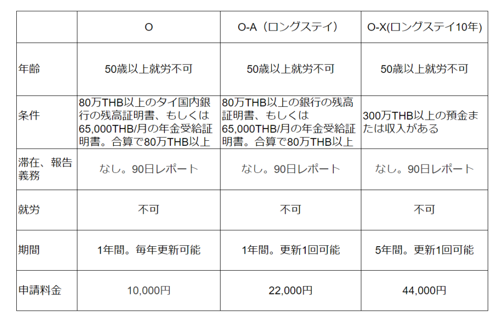 他国のビザと比較しても年齢以外のハードルがとても低いのが特徴です。O-Aは少し変わっており、日本国内で取得することを前提としているようです。ただし更新は1回のみ可能でビザをキャンセルする際も日本で行わなければなりません。タイで50歳以上のビザの場合、リタイアメントビザとよばれるOビザを取るのが一般的です。