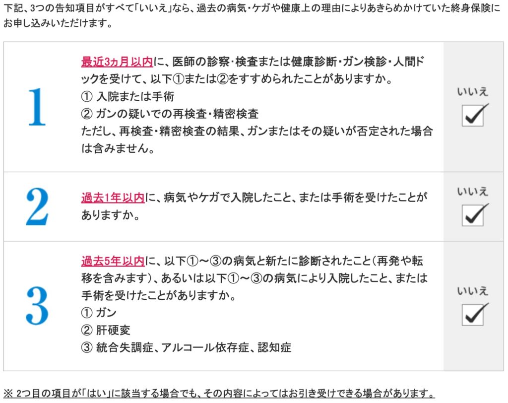 上記で説明した通り告知が緩いので、持病や通院中、入院や手術歴がある方でも加入しやすいです。この手の商品は他社も出しているが、ポイントは「告知の緩さ」と「保険料」のバランスです。保険会社としては相反する条件になるので、一般的には告知が緩いと保険料が高くなり、告知が厳しいと保険料が安くなります。メットライフの告知は若干緩く、保険料もそこそこ安いので、この分野では頑張っている方です。ただし契約して最初の1年間は病気死亡の場合、保険金が半分になります。