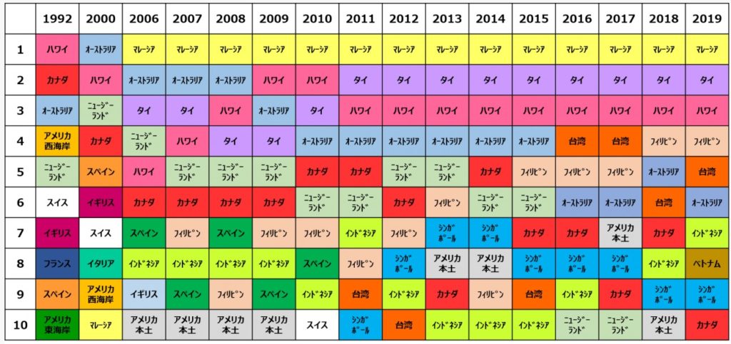 AfrAsia Bank(アフラシア)銀行が、100万USD以上の投資可能資産を所有する富裕層の移住人数を参考にランキング化したものです。オフショアでおなじみのモーリシャス共和国に拠点を置く金融機関です。オーストラリアが1位で2位がアメリカですね。しかもオーストラリアは5年連続の1位です。日本人の人気ランキングはアジア中心ですが、それと大きく異なっています。