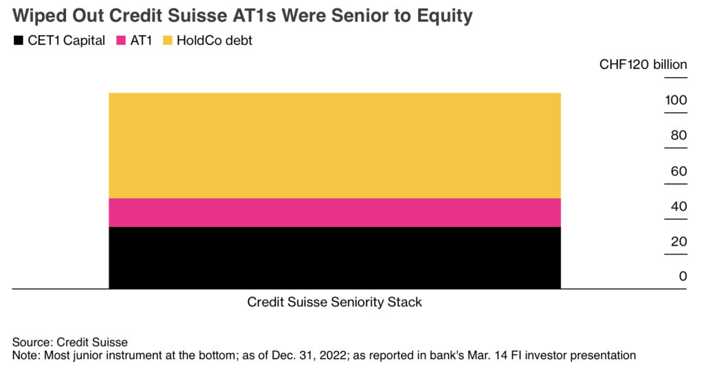 AT1債とは償還期限のない永久債です。破綻時の返済優先順位が普通債よりも後で、株式よりも前となっていました。しかしクレディ・スイス破綻の際にはなんと株式よりも先に無価値とされてしまったのです。資本市場では意味不明な話でしたが、そのまま株主総会も通さず決まってしまいました。